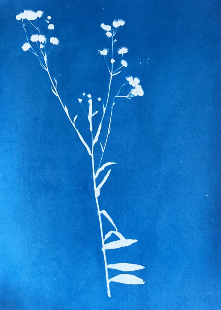einzelne ausgerissene pflanzen dokumentiere ich mittels cyonotypie-drucken, eine referenz an anna atkins.
